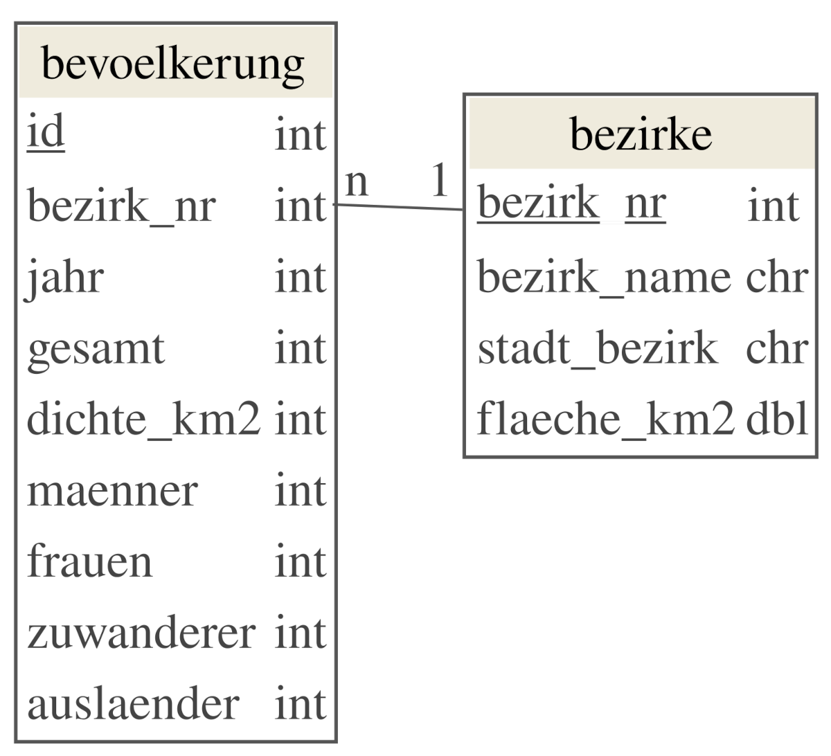 bonn.sqlite. Folgende Elemnten sind sichtbar: Relationen (Tabellen), Beziehung (1:n), Tabellennamen, Attributen (Spalten, Felder, Variablen), Datentypen, Schlüssel und Fremdschlüssel.Weitere Links zur Konzepte: